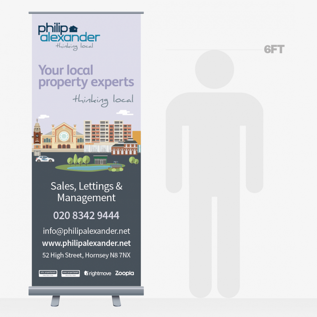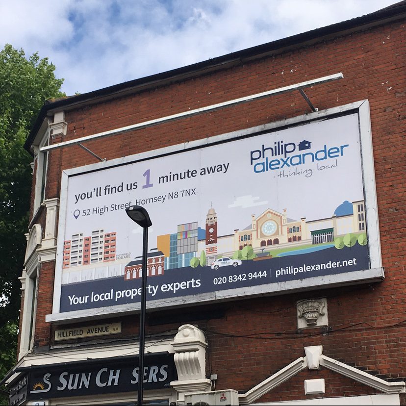 Over the past 7 years, I have had the privilege of designing a vast range of marketing material for this north London based estate agent. This has included flyers and brochures, billboards, storefront concepts and illustrations of local buildings/landmarks. PhilipAlexander has adopted the use of my illustrations across all of their advertising efforts. Local residents can trust their expert knowledge and they’re very proud to be independent, which is something that sits at the heart of their brand identity.