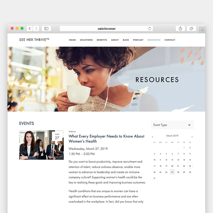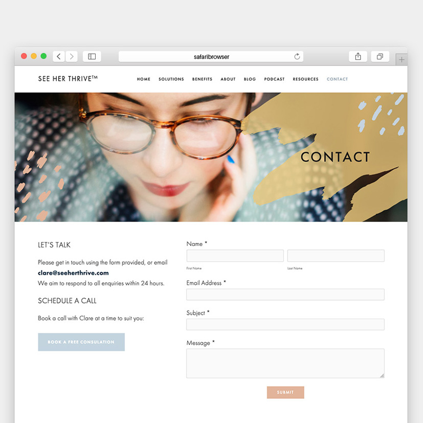 This was a Squarespace website built in 2018 for exciting new consultancy See Her Thrive™. Founder Clare is striving to break down the stigma surrounding women’s health in the workplace, through raising awareness and educating others, so it needed to be clean, bright, easy to navigate and informative.